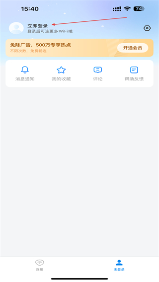 1、打开wifi万能钥匙APP,进入到首页内,点击下方未登录的按钮。