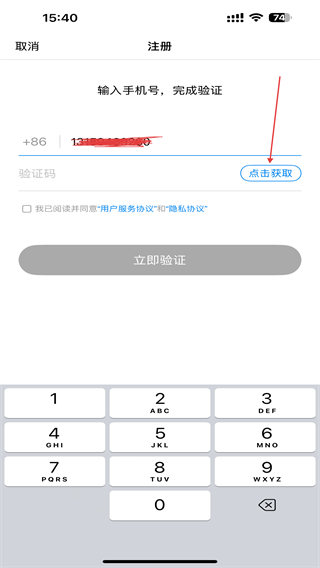 3、进入到登录的页面内,输入要登录的手机号并点击获取。