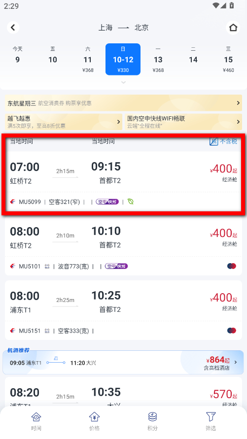2、在搜索结果页面,浏览各个航班的起飞时间、降落时间、价格等信息,选择合适的航班。