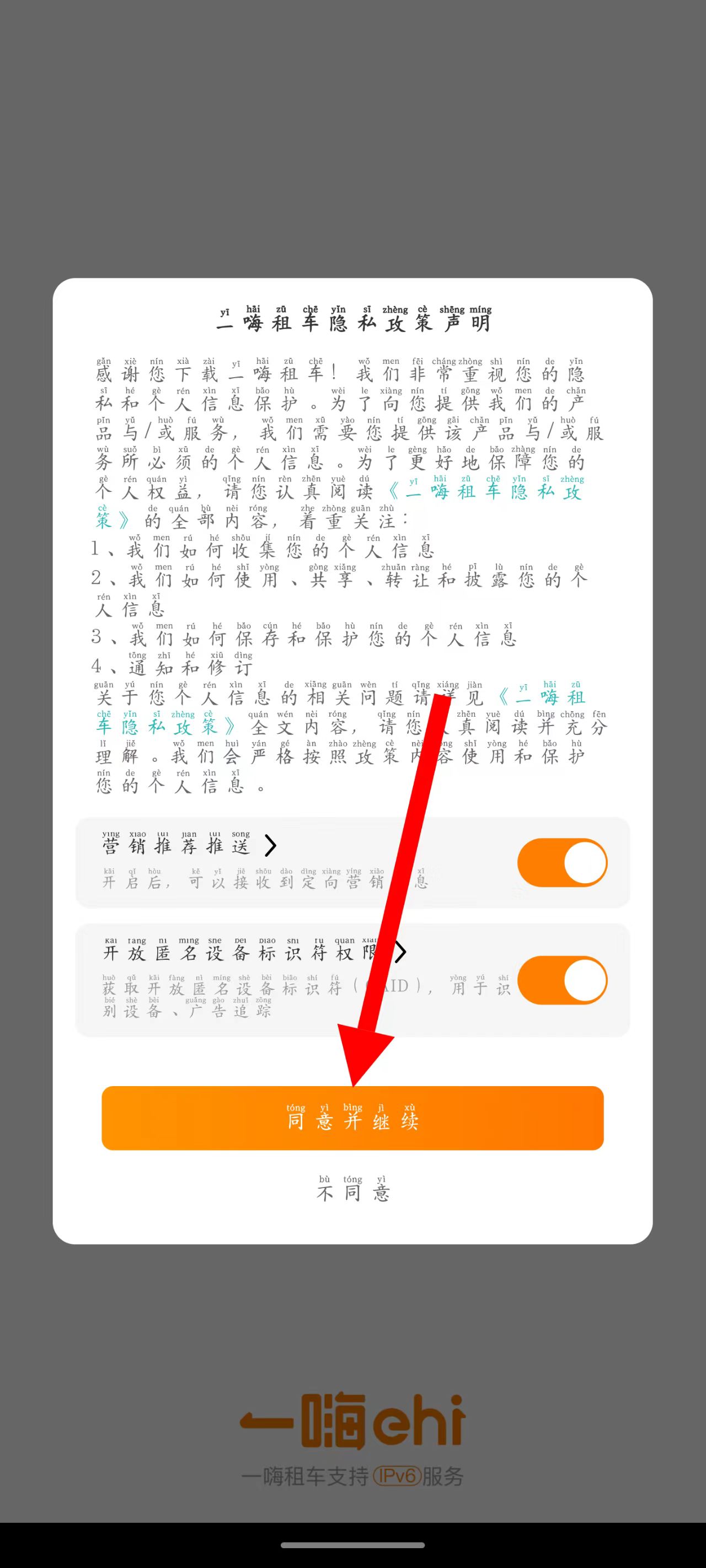 1、打开APP,在隐私政策声明页面点击同意并继续。
