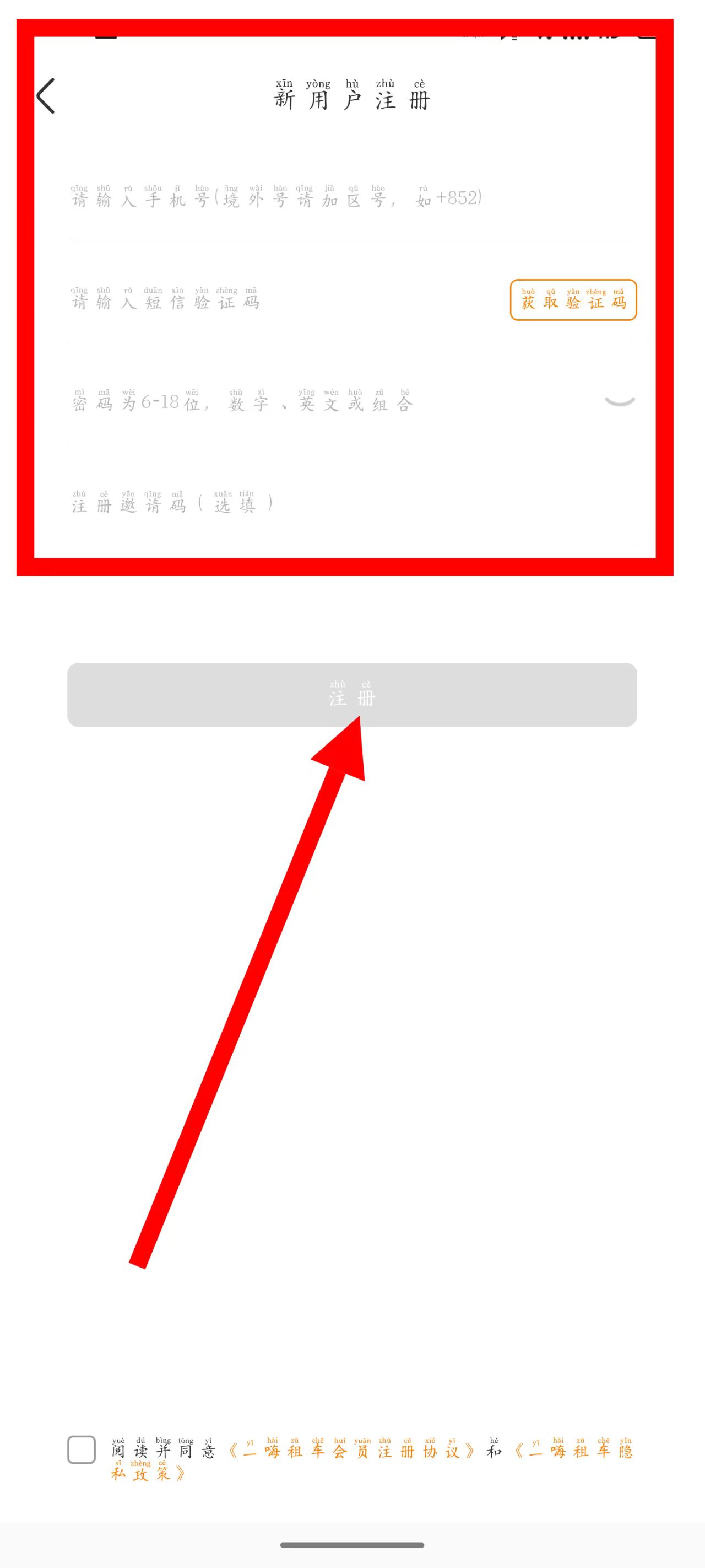 4、输入手机号、验证码,勾选同意相关协议后,点击注册,完成操作。