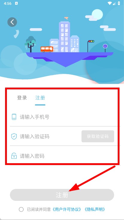 4、在注册页面,依次输入手机号、验证码、密码,点击注册完成操作。