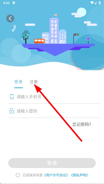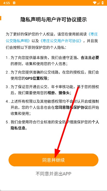 1、打开枣庄公交,在隐私声明与用户许可协议提示页面点击同意并继续。