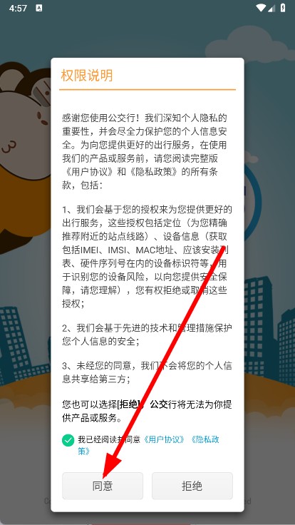 1、打开公交行,在权限说明页面,勾选后,点击同意。