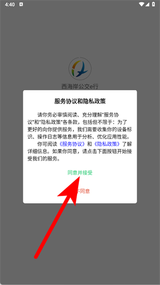 1、打开西海岸公交e行,在提示页点击同意并接受。