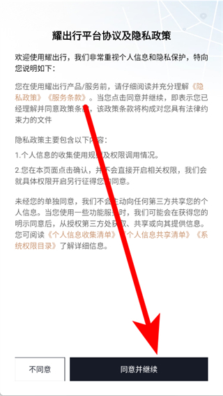 1、打开耀出行,在平台协议及隐私政策页面点击同意并继续。