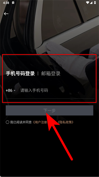 3、选择手机号码登录,输入手机号码,勾选后,点击下一步。