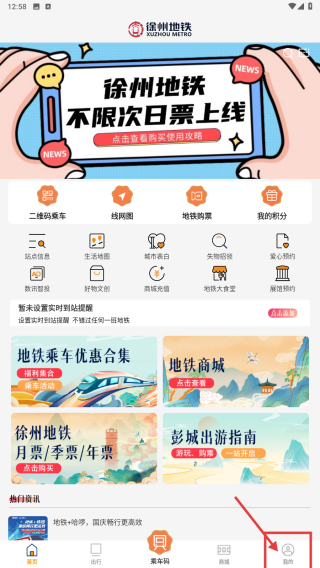 1、打开徐州地铁应用,点击底部我的选项,进入个人中心页面。
