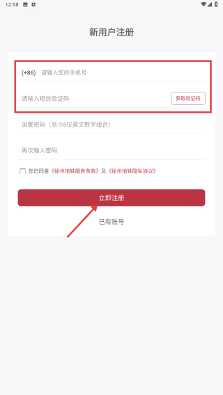 4、依次填写手机号、短信验证码、设置密码等信息,勾选协议后点击立即注册按钮,完成账号注册。