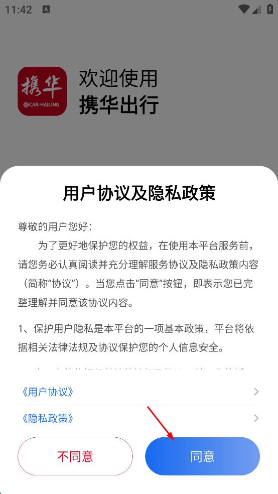 1、打开携华出行,在弹出的用户协议及隐私政策页面,点击同意,进入携华出行主页面。