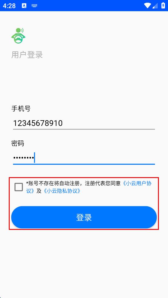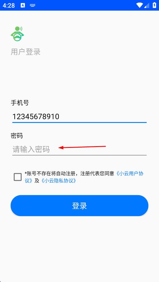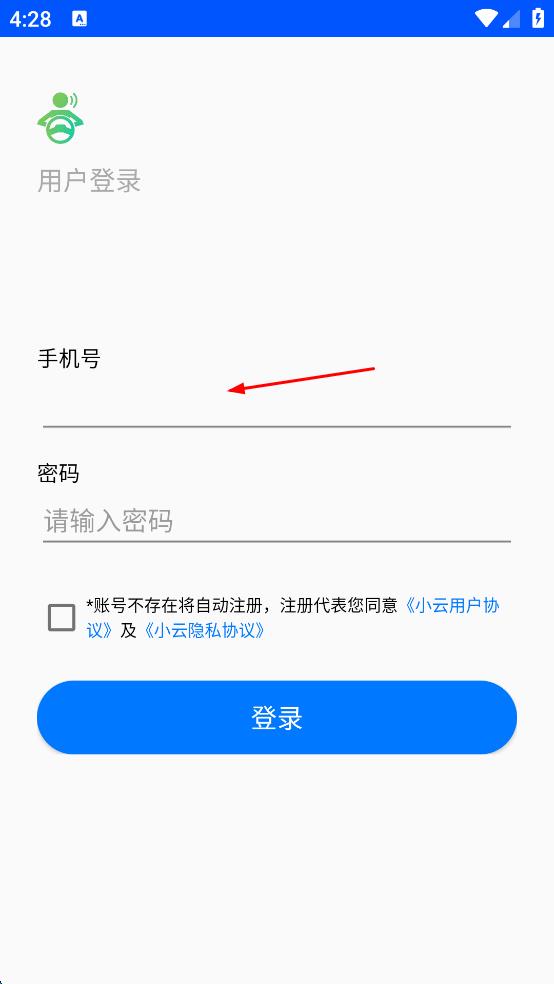 4、勾选账号不存在将自动注册,注册代表您同意小云用户协议及小云隐私协议,点击登录。