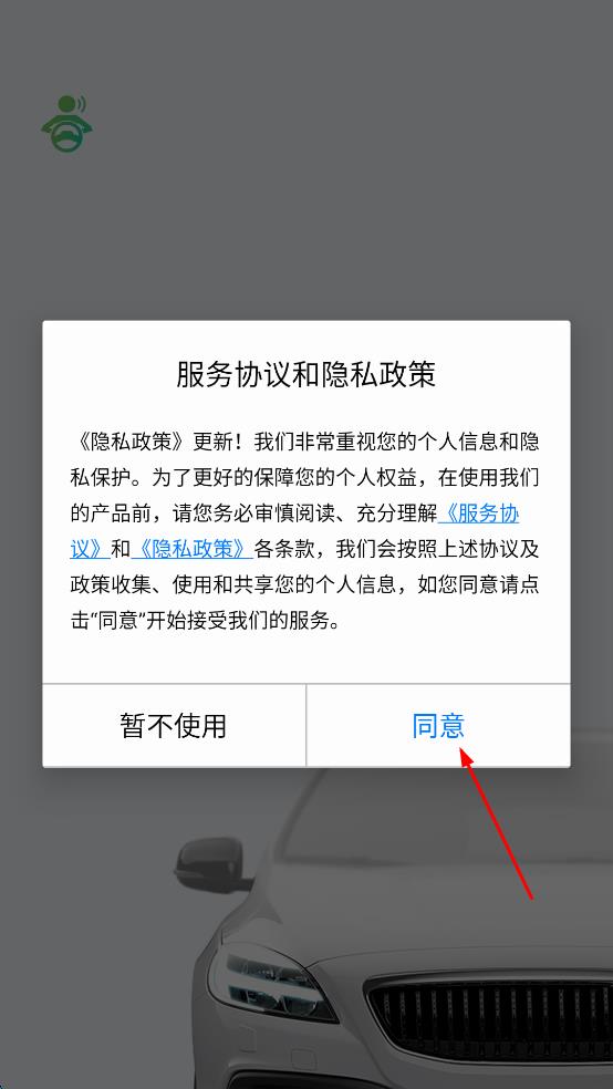 1、打开小云,出现服务协议和隐私政策提示框,点击同意。