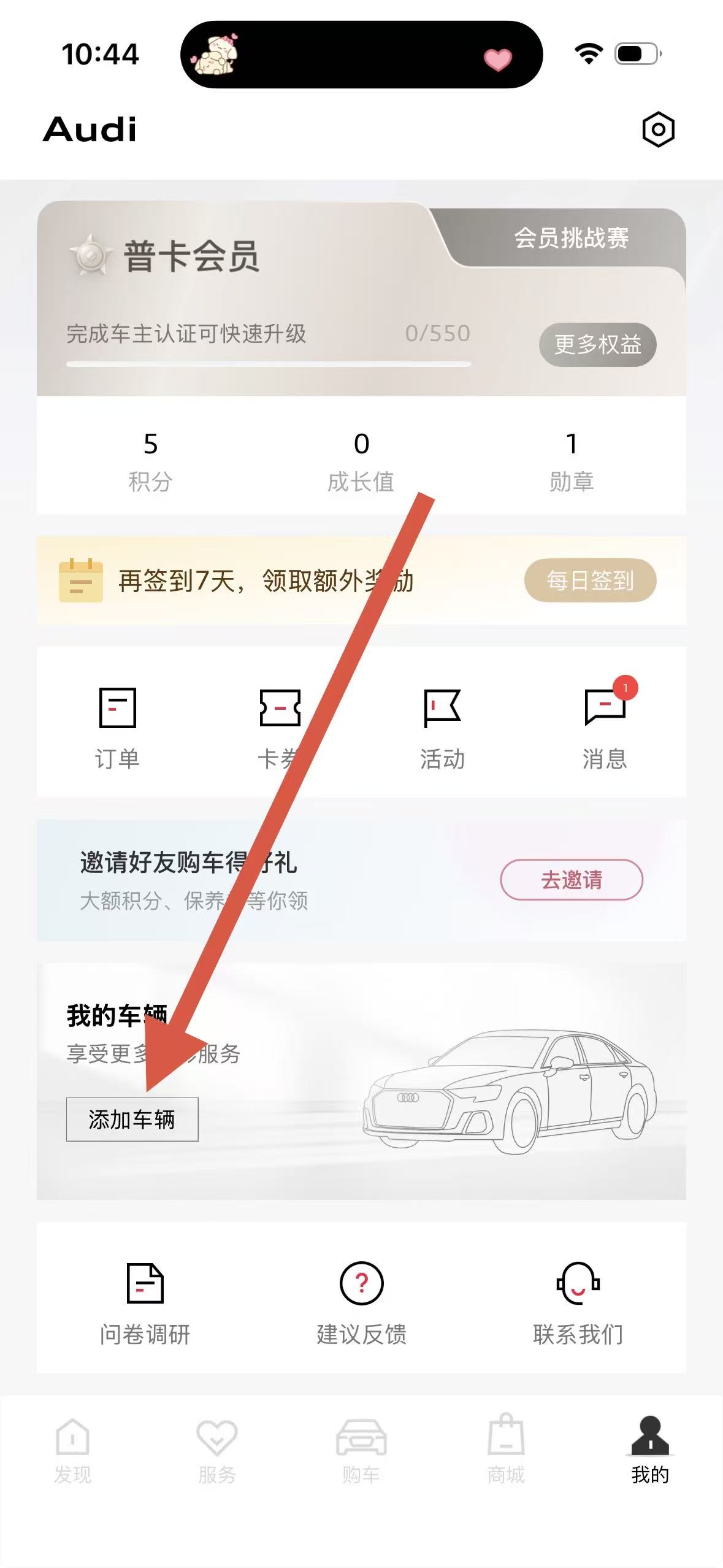 1、打开一汽奥迪app,在首页点击下方我的选项,进入个人界面。