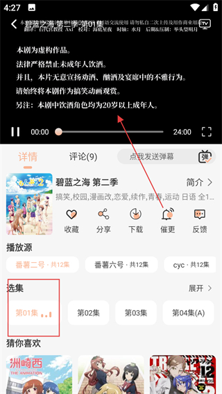3、在番剧播放页面的选集区域,选择第1集观看番剧内容。
