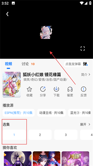 3、在动漫播放页面的选集区域选择集数如1,点击屏幕观看动漫。