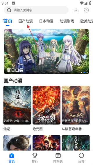 1、进入软件首页,点击顶部国产动漫标签,进入国产动漫分类页面。