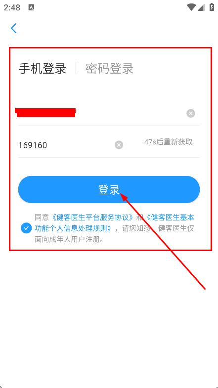 4、输入手机号和验证码,点击登录,完成登录操作。