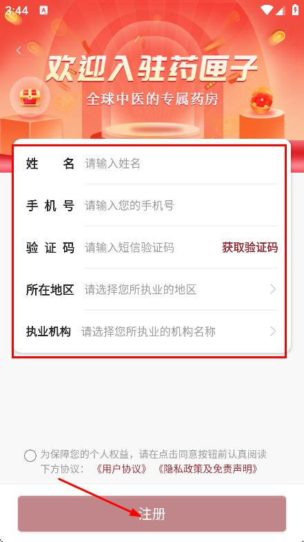 4、填写姓名、手机号等信息,获取并输入验证码,点击注册,完成注册操作。