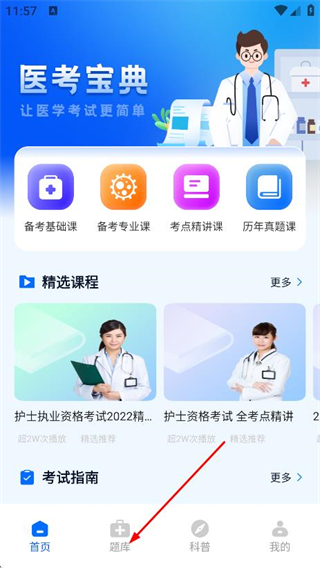 1、进入后在首页,点击底部的题库,进入题库页面。