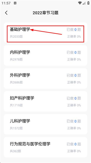 3、在2022章节习题页面,点击学科,进入该学科题目页面。
