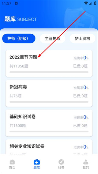 2、在题库页面,点击习题,进入2022章节习题页面。