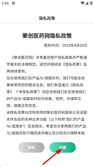 1、在聚创医药网隐私政策页面,点击同意,进入首页。