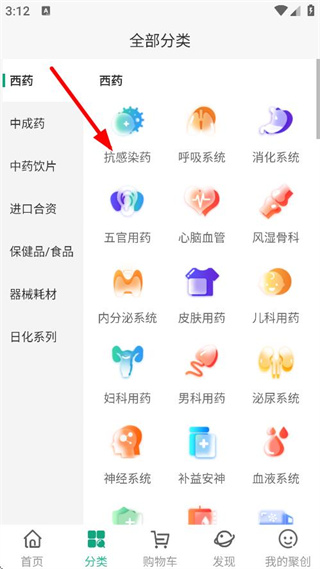 3、在全部分类页面,点击抗感染药,进入抗感染药列表页面。