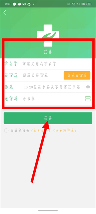 4、依次填写手机号、验证码等信息,点击注册,完成注册。