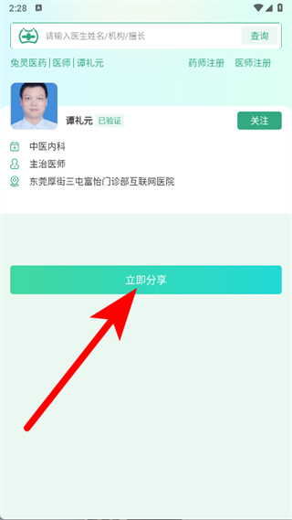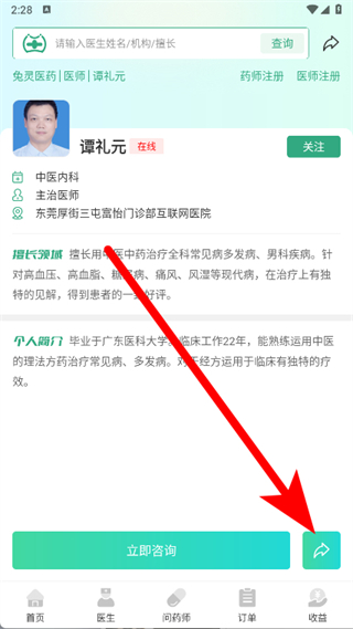 3、进入医生详情页后,点击页面右下角的分享图标。