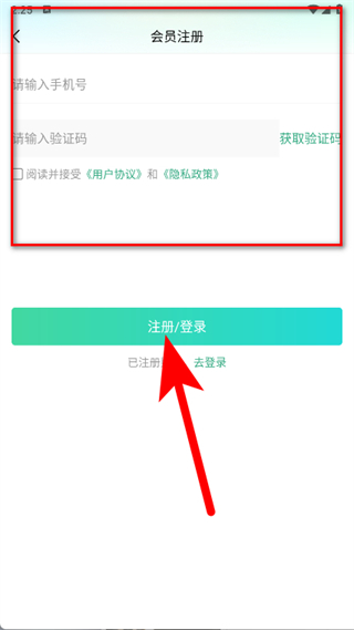4、输入手机号、验证码,勾选后,点击注册登录,完成注册。