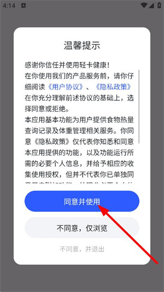 1、在温馨提示弹窗中,点击同意并使用,进入轻卡健康主页面。