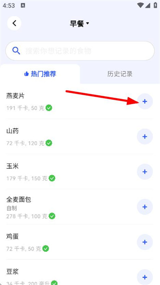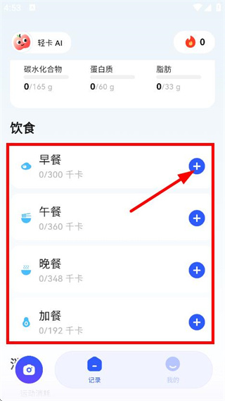 2、在页面饮食板块,点击对应餐食旁的+号,进入餐食添加页面。