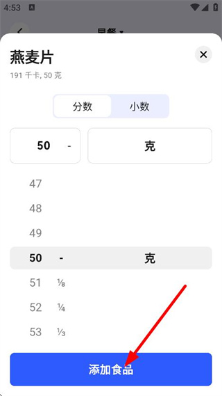 4、在食物分量设置页面,设置好分量后,点击添加食品,完成食物添加。