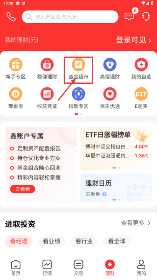 2、在理财功能页面,点击基金超市选项,进入基金超市界面。