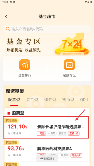 3、在基金超市界面,找到景顺长城沪港深精选股票型基金条目,点击进入基金详情页。