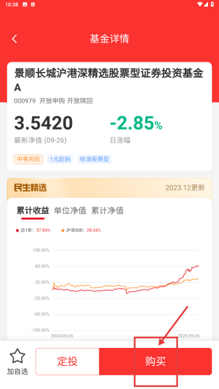 4、在基金详情页,点击购买按钮,进行基金购买操作。