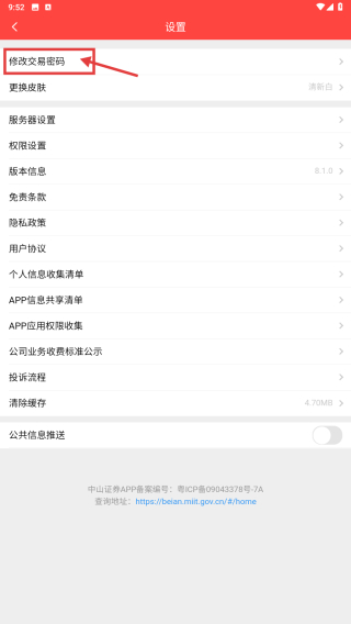 3、在设置界面,点击修改交易密码选项,进入账户激活页面。