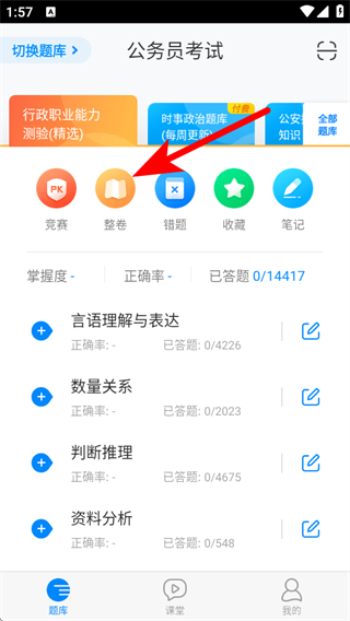 1、在公务员考试题库页面,点击整卷按钮,进入整卷模考的页面。