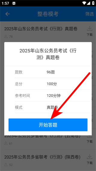 2、在整卷模考的页面,可以选择目标真题卷,弹出试卷详情框。