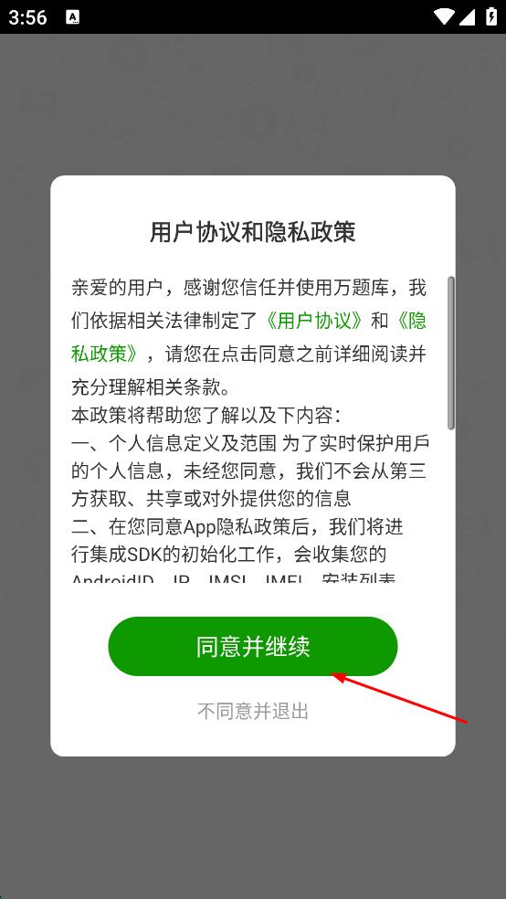 1、打开万题库,出现用户协议和隐私政策提示框,点击同意并继续。
