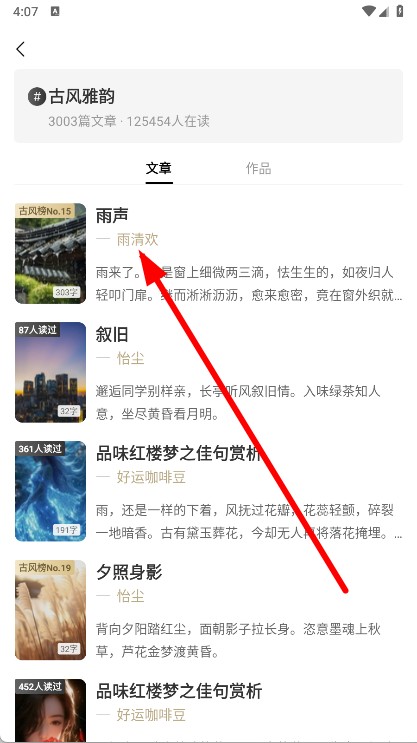 3、进入古风雅韵分类页面后,选择一篇文章。