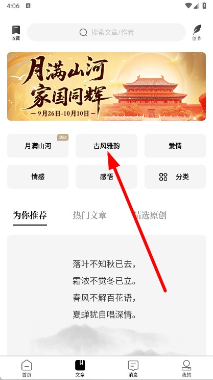 2、在文章页面,点击古风雅韵分类。