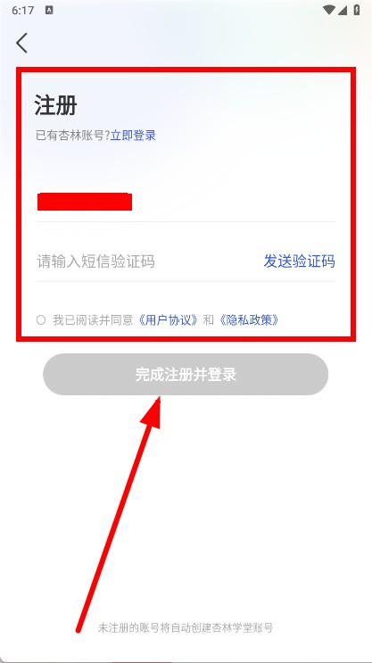 4、在新页面输入短信验证码,勾选同意后,点击完成注册并登录按钮。