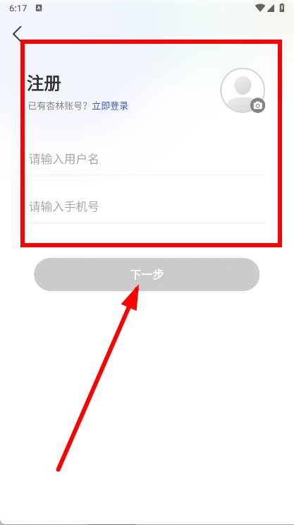 3、进入注册页面,输入用户名、手机号,点击下一步。