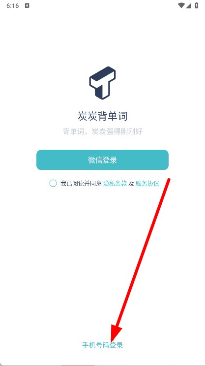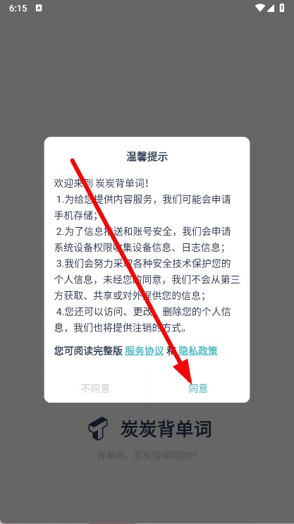 1、打开炭炭背单词APP,在温馨提示页面点击同意。