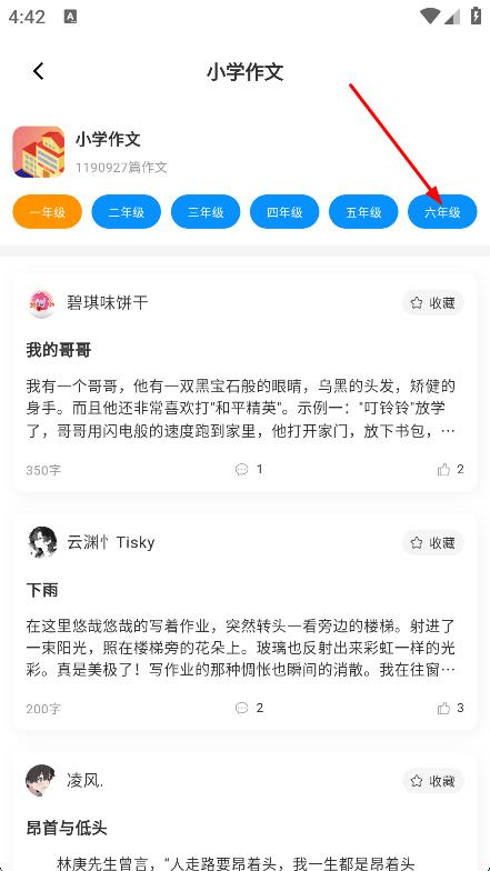 2、在小学作文页面,点击六年级,查看六年级作文列表。