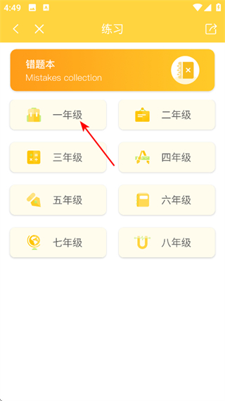 2、在练习页面,点击一年级,进入一年级课本选择页面。