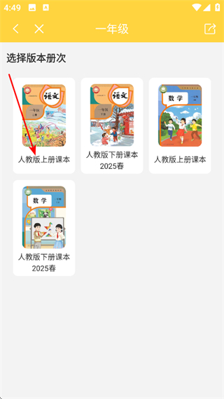 3、在一年级课本选择页面,选择要学习的课本,如人教版上册课本。
