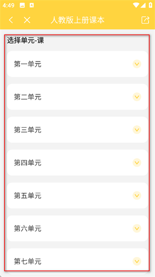 4、进入人教版上册课本页面后,可选择单元-课进行学习。