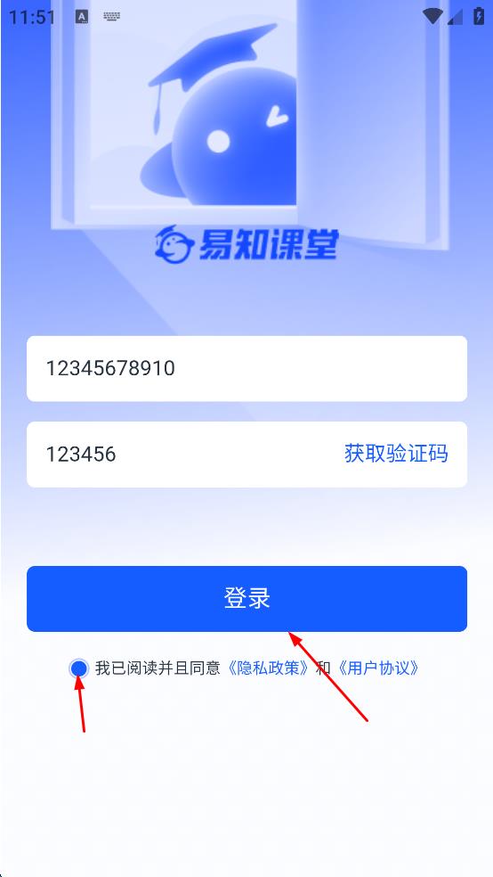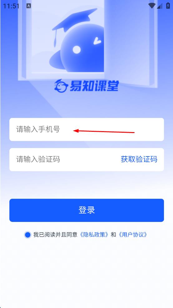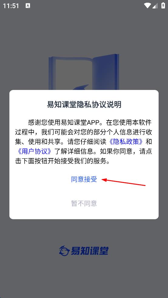 1、打开易知课堂应用,在弹出的隐私协议说明界面,点击“同意接受”按钮,进入登录页面。